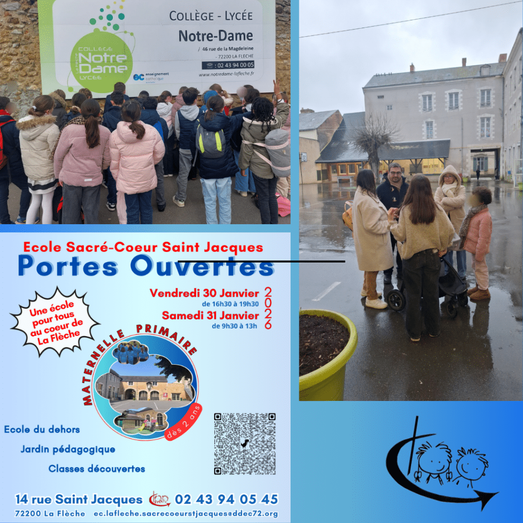 L’école Sacré-Cœur Saint-Jacques de La Flèche vous ouvre ses portes le vendredi 30 janvier de 16 h 30 à 19 h 30 et le samedi 31 janvier de 9 h 30 à 13 h. L’équipe pédagogique répondra à vos questions, vous fera découvrir nos locaux et vous présentera les projets et actions menés tout au long de l’année.